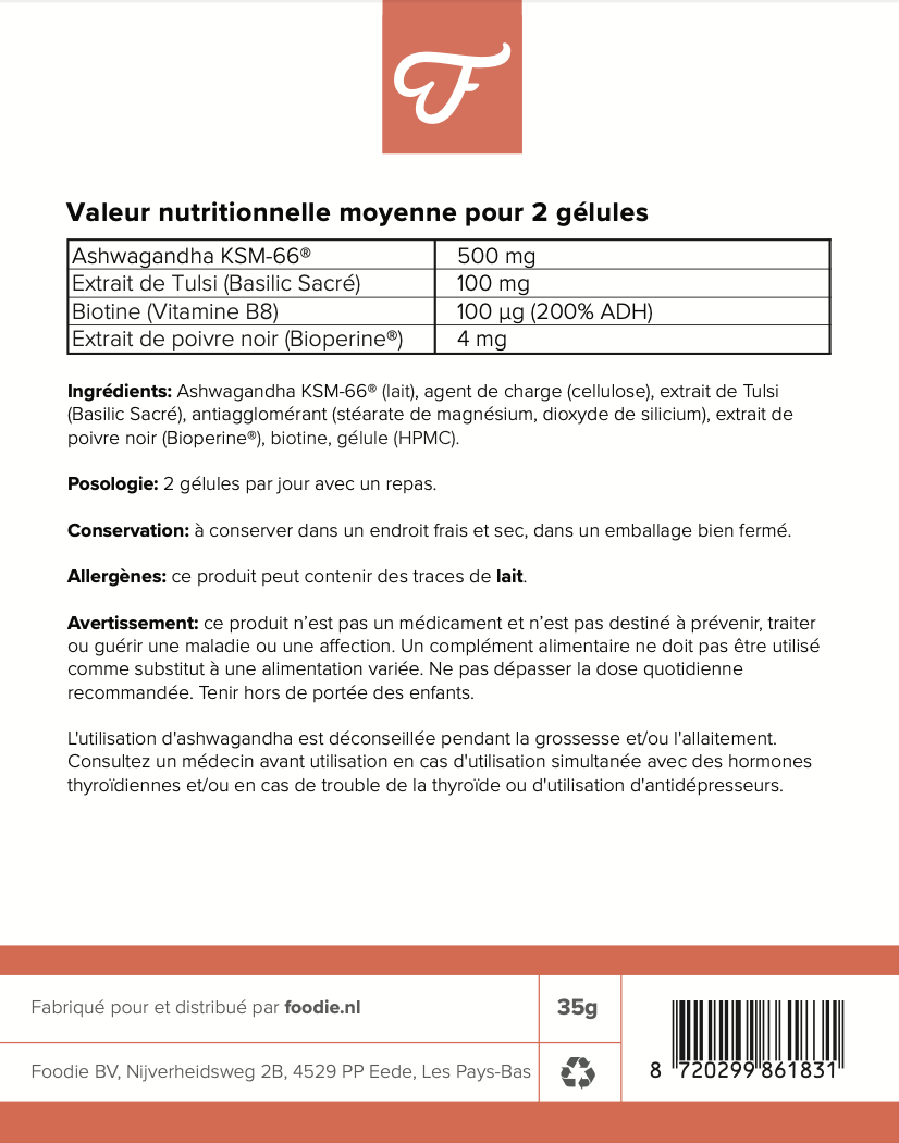 La biotine contribue à la santé de la peau, des cheveux et des ongles, et soutient le métabolisme énergétique. L’extrait de tulsi, également connu sous le nom de basilic sacré, agit comme un antioxydant et favorise le bien-être mental.