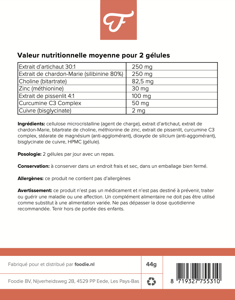 Cette formule unique associe 7 extraits et minéraux puissants, dont le chardon-Marie pour la détoxication, les extraits de pissenlit et d’artichaut pour la fonction hépatique et biliaire, ainsi que la curcumine pour soutenir à la fois la santé du foie et une digestion saine. La choline favorise un métabolisme normal des graisses, tandis que le zinc et le cuivre offrent une protection contre le stress oxydatif, le zinc contribuant également au bon fonctionnement du système immunitaire.