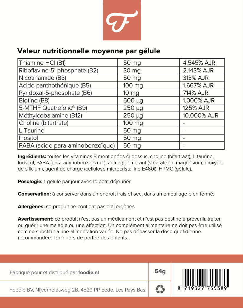 Le Vitamine B Complex de Foodie contient les huit vitamines B essentielles ainsi que de la taurine, de l’inositol, du PABA et de la choline.