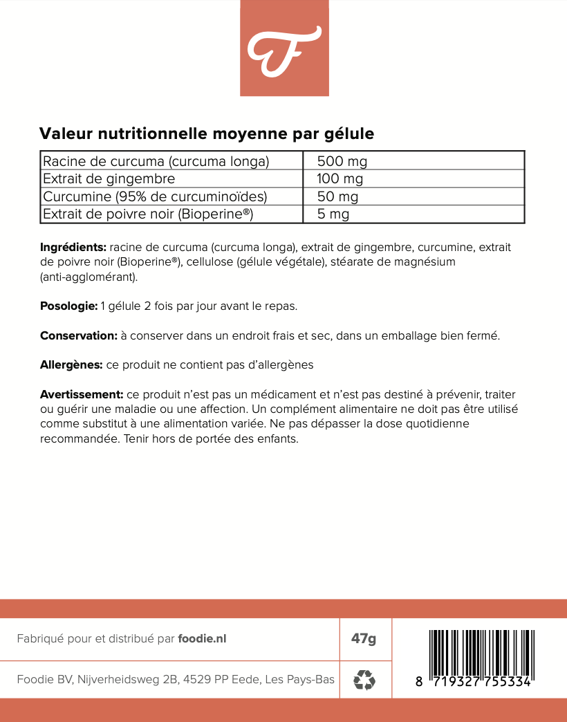 - Bioperine® est ajoutée à ce complément pour améliorer l’absorption de certains composés, en particulier la curcumine, qui est naturellement difficile à assimiler. Grâce à la Bioperine®, l’absorption de la curcumine peut augmenter jusqu’à 2 000 %. En plus de ce rôle, la Bioperine® possède ses propres propriétés antioxydantes, protégeant l’organisme contre le stress oxydatif et les dommages causés par les radicaux libres.