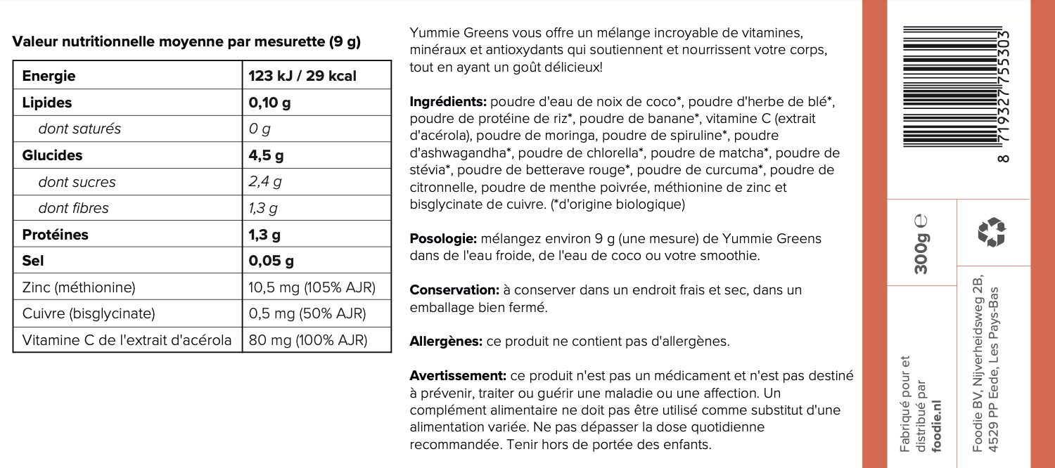 Yummie Greens est une poudre de super-aliments savoureuse qui vous apporte votre portion quotidienne de nutriments essentiels, sans l’arrière-goût amer souvent présent dans d’autres poudres de greens. Grâce à un mélange soigneusement élaboré de 13 ingrédients puissants, dont l’herbe de blé, la chlorelle, la spiruline, le matcha, le moringa et l’acérola, Yummie Greens fournit à votre corps des vitamines, minéraux et antioxydants indispensable.