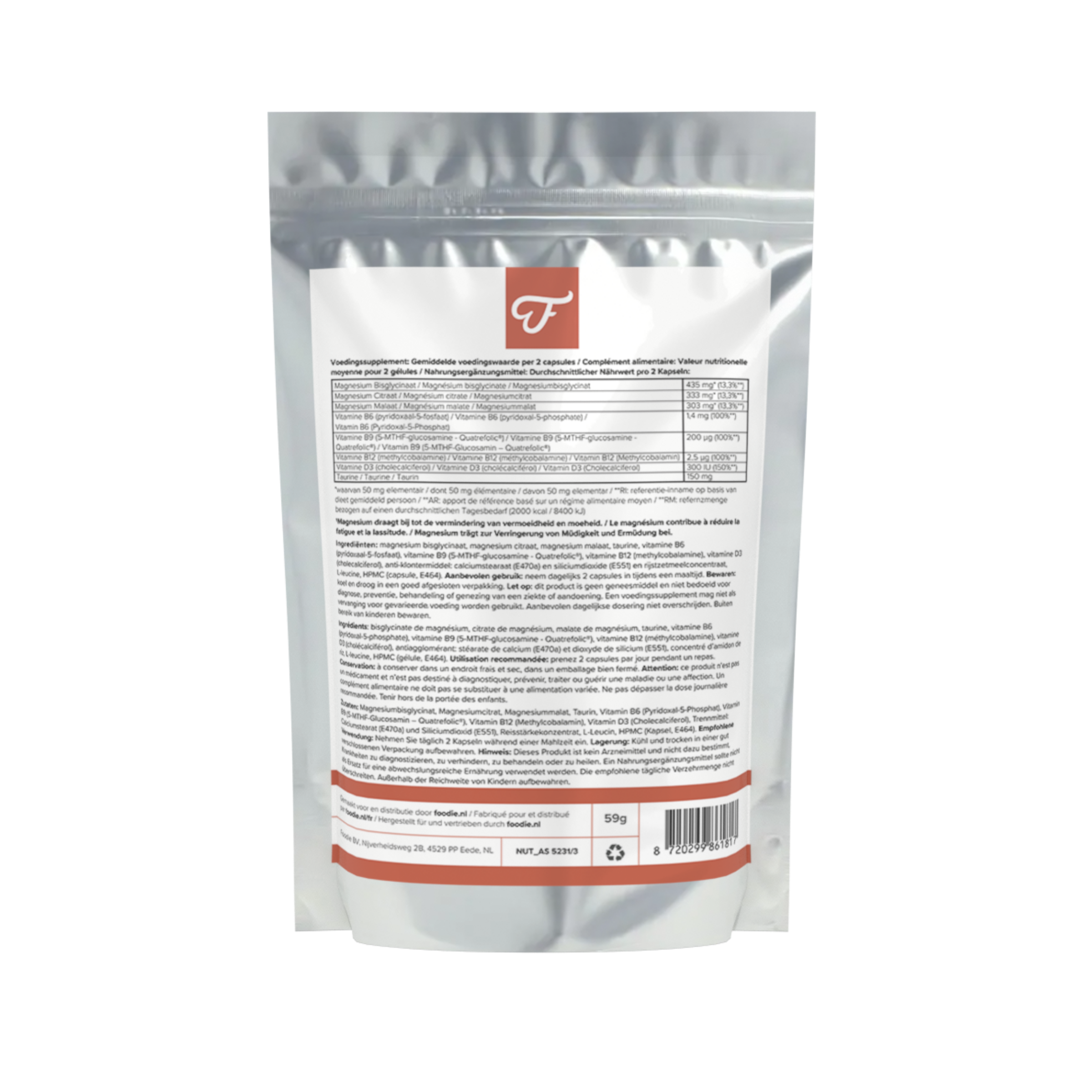 Ingrédients: bisglycinate de magnésium, citrate de magnésium, malate de magnésium, taurine, vitamine B6 (pyridoxal-5-phosphate), vitamine B9 (5-MTHF Quatrefolic®), vitamine B12 (méthylcobalamine), vitamine D3 (cholécalciférol), acides gras liés au calcium, leucine fermentée vega 100%, concentré d’amidon de riz, dioxyde de silicium (antiagglomérant), HPMC (capsule).