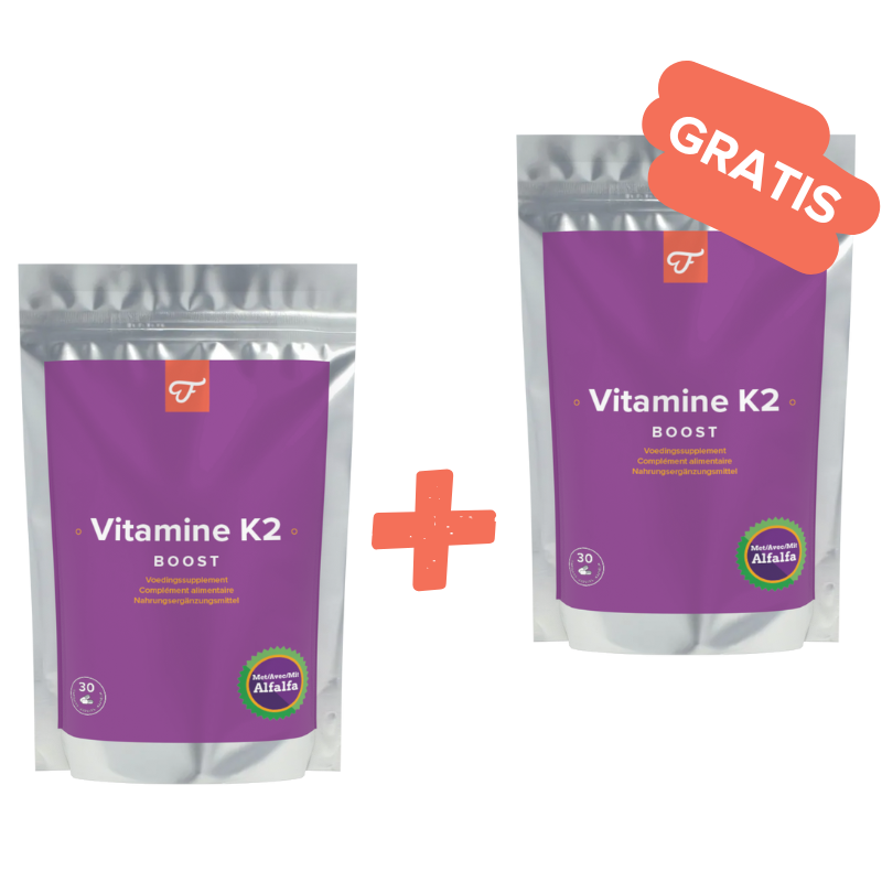 • De samenwerking met vitamine D3: vitamine D3 zorgt dat je meer calcium uit je voeding opneemt. Maar als er onvoldoende K2 aanwezig is, kan dat extra calcium alsnog verkeerd neerslaan in je lichaam. Je kunt het zo zien: D3 opent de deur voor calcium, K2 vertelt het waar het heen moet.