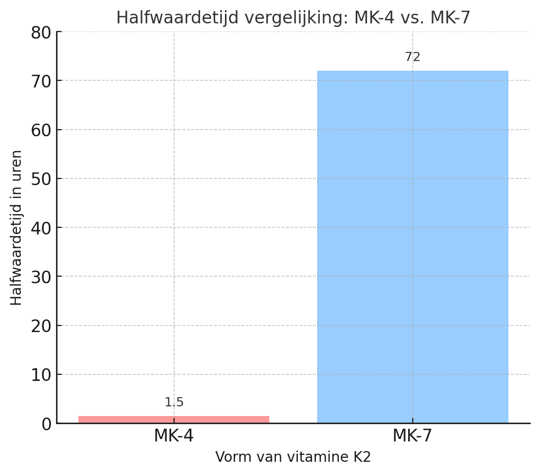 Het grote verschil tussen deze vormen zit in de halfwaardetijd (= de tijd die een stof in het bloed aanwezig blijft voordat de helft wordt afgebroken of uitgescheiden). MK-4 wordt heel snel afgebroken en blijft vaak maar een paar uur in het bloed aanwezig. Om daar effect van te hebben, zou je dus hoge doseringen en meerdere inname-momenten per dag nodig hebben.