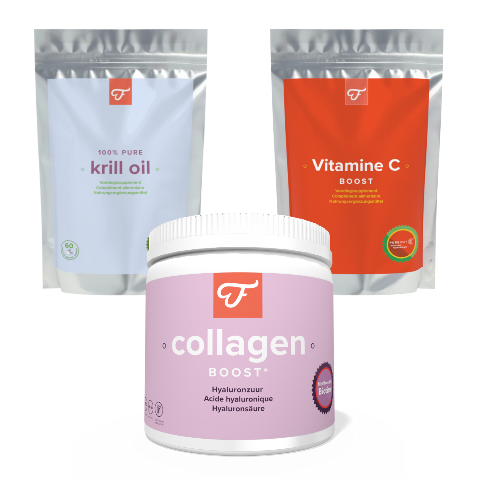 Deze bundel bevat de juiste vitaminen, eiwitten en essentiële vetzuren die bijdragen aan de natuurlijke aanmaak van collageen voor een stevige en elastische huid. Daarbij draagt het bij aan sterk en gezond haar en nagels dankzij de collageen en biotine in de Collagen Boost. En het ondersteunt een gehydrateerde en stralende huid dankzij devomega-3 vetzuren uit Krill Oil en hyaluronzuur.